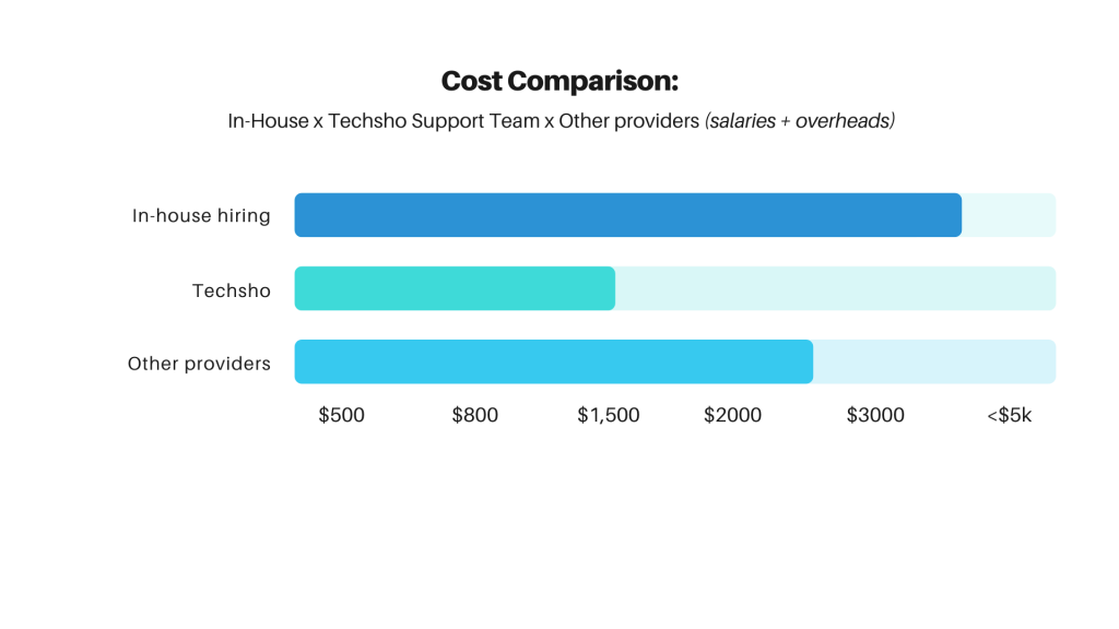 Hiring in-house agents in the US, Canada, or Europe can cost $4,000–$6,000/month per agent — not including training, benefits, or turnover costs. A fractional team can provide the same output at a fraction of the cost, with faster ramp-up. For instance, at Techsho, you can get a team of 2 CSRs for $1,500/month and add representatives as you go, according to your expected volume. - Speed to Scale